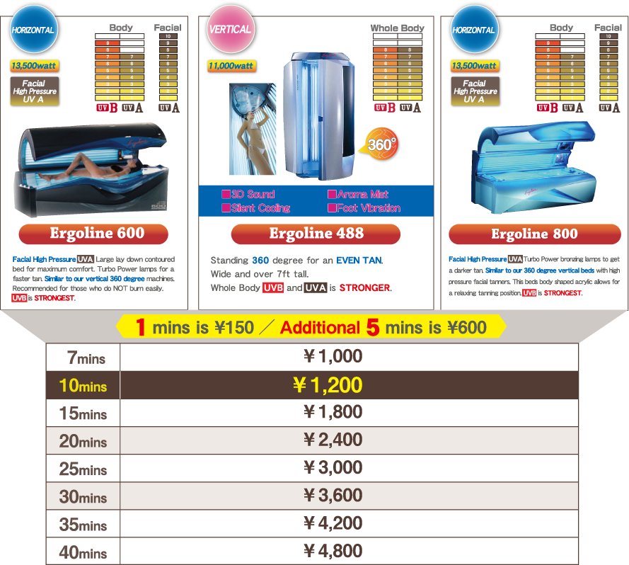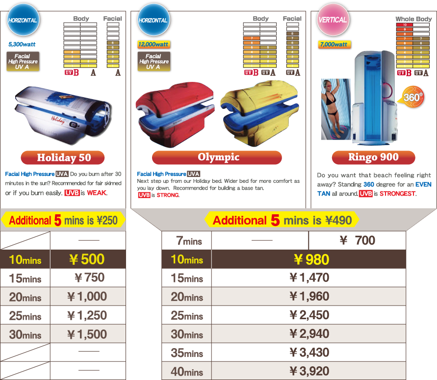 Example: If you would like to tan 20minutes but only have 10 minute ticket you can use the ticket then pay for the additional 10 minutes using ¥,$ or credit card.